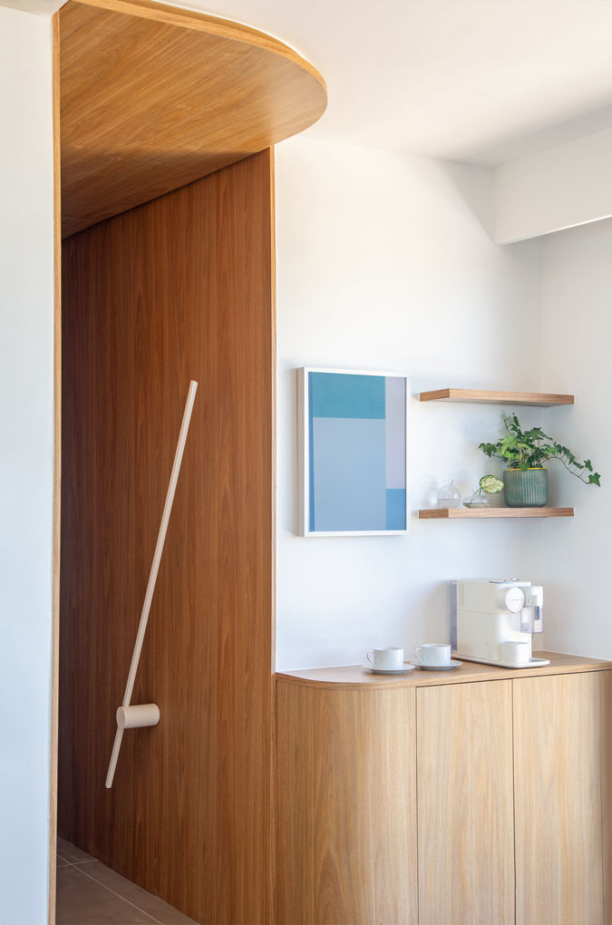 O hall de entrada, antes um corredor estreito e opressivo, foi revestido em madeira das paredes ao teto, com estante decorativa, quadro ao fundo e iluminação quente. A transformação é imediata: quem entra já sabe que o apartamento tem personalidade.